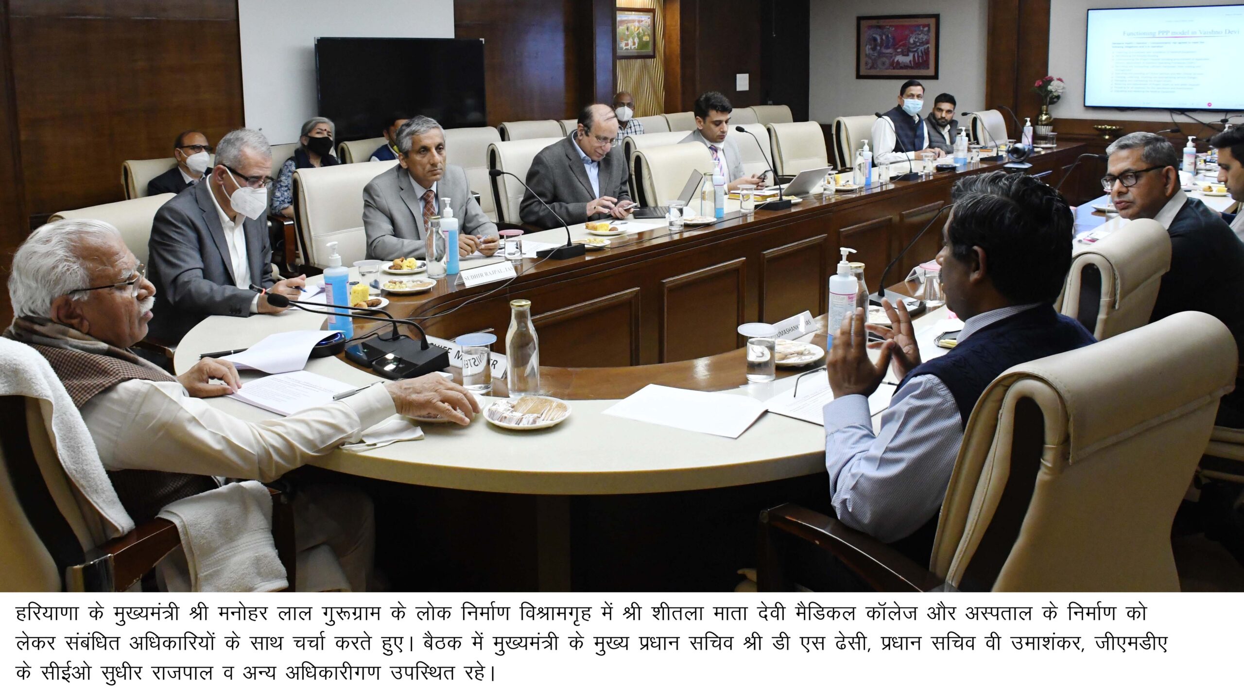 गुरूग्राम, 20 फरवरी। गुरूग्राम जिला का श्री शीतला माता देवी मैडिकल कॉलेज एवं अस्पताल पब्लिक प्राईवेट पार्टनर्शिप के अनूठे नए मॉडल पर बनाया जाएगा जिसमंे गुरूग्राम वासियों को कम खर्च पर गुणवत्ता की अफोर्डेबल हैल्थकेयर सुविधा उपलब्ध होंगी। इस मैडिकल कॉलेज व अस्पताल के स्वरूप को लेकर रविवार को मुख्यमंत्री श्री मनोहर लाल ने संबंधित अधिकारियों के साथ विस्तार से चर्चा की। यह बैठक गुरूग्राम के लोक निर्माण विश्रामगृह में आयोजित की गई थी।