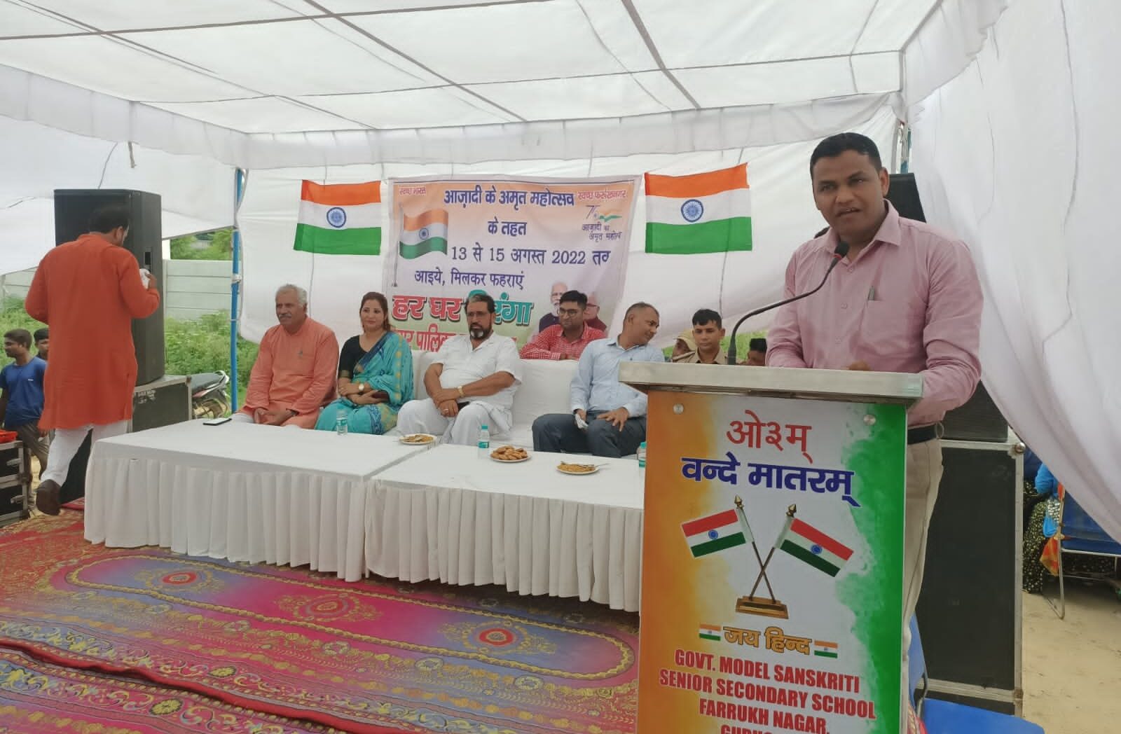 देश आज आजादी की 75वीं वर्षगांठ पर आजादी का अमृत महोत्सव मना रहा है और इस दौरान आजादी के वीरों और ऐतिहासिक स्थलों को भी याद किया जा रहा है। इसी कड़ी में फरूखनगर में यह कार्यक्रम आयोजित किया गया जिसमें पटौदी के एसडीएम प्रदीप कुमार मुख्य अतिथि थे। देशभक्ति से परिपूर्ण कार्यक्रम के माध्यम से लोगों को अपने घर पर तिंरगा फहराने का संदेश दिया गया। एसडीएम प्रदीप कुमार ने भी अपने संबोधन में हर घर तिरंगा अभियान का उल्लेख किया और फरूखनगरवासियों को फरूखनगर के आजादी आंदोलन के इतिहास से रूबरू करवाते हुए इस स्वतंत्रता दिवस पर अपने अपने घर , दुकान, ऑफिस आदि सभी इमारतों पर तिंरगा फहराने का आह्वान किया। उन्होंने भारतीय ध्वज संहिता में दिए गए राष्ट्रीय ध्वज की मर्यादा रखने संबंधी प्रावधानों के बारे में भी विस्तार से बताया।