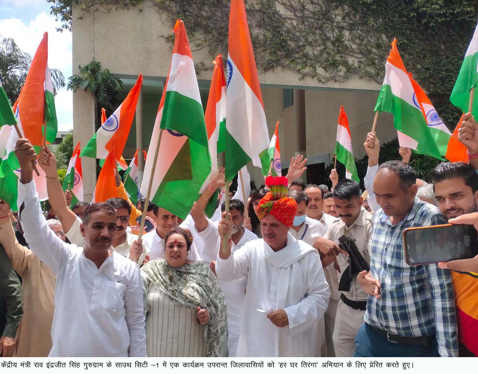 राव ने “हर घर तिरंगा” अभियान के उद्देश्यों पर प्रकाश डालते हुए कहा कि इस अभियान का उद्देश्य नागरिकों के मन में राष्ट्र के प्रति कर्त्तव्य बोध उत्पन्न करके आगामी 25 वर्षो के संकल्पों को पूरा करने का प्रण लेना है। इसकी शुरूआत प्रधानमंत्री ने की है लेकिन इसको पूर्णता की ऊंचाइयों पर ले जाने का कर्तव्य हम सभी भारतीयों का है। इस दौरान केंद्रीय मंत्री ने जिलावासियों में तिरंगा अभियान की अलख जगाने के लिए साउथ सिटी में संक्षिप्त तिरंगा यात्रा भी की जिसमें विभिन्न आरडब्ल्यूए व जिला के अनेक गणमान्य व्यक्ति शामिल रहे।