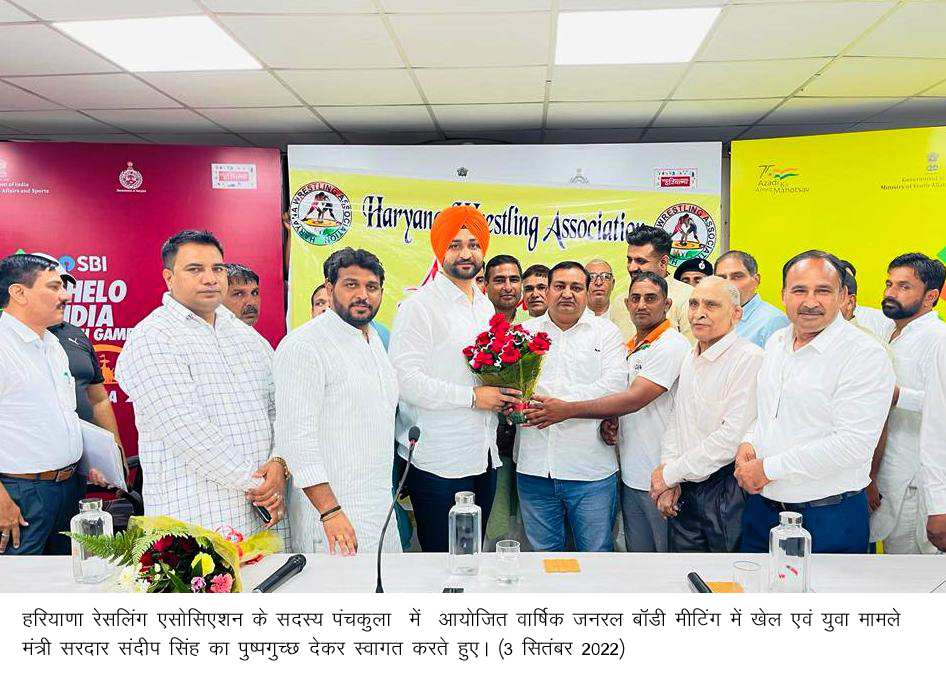 चंडीगढ़, 3 सितंबर- हरियाणा रेसलिंग एसोसिएशन की वार्षिक जनरल बॉडी मीटिंग में सर्वसम्मति से हरियाणा के खेल एवं युवा मामले मंत्री सरदार संदीप सिंह को एसोसिएशन का प्रधान चुना गया है।