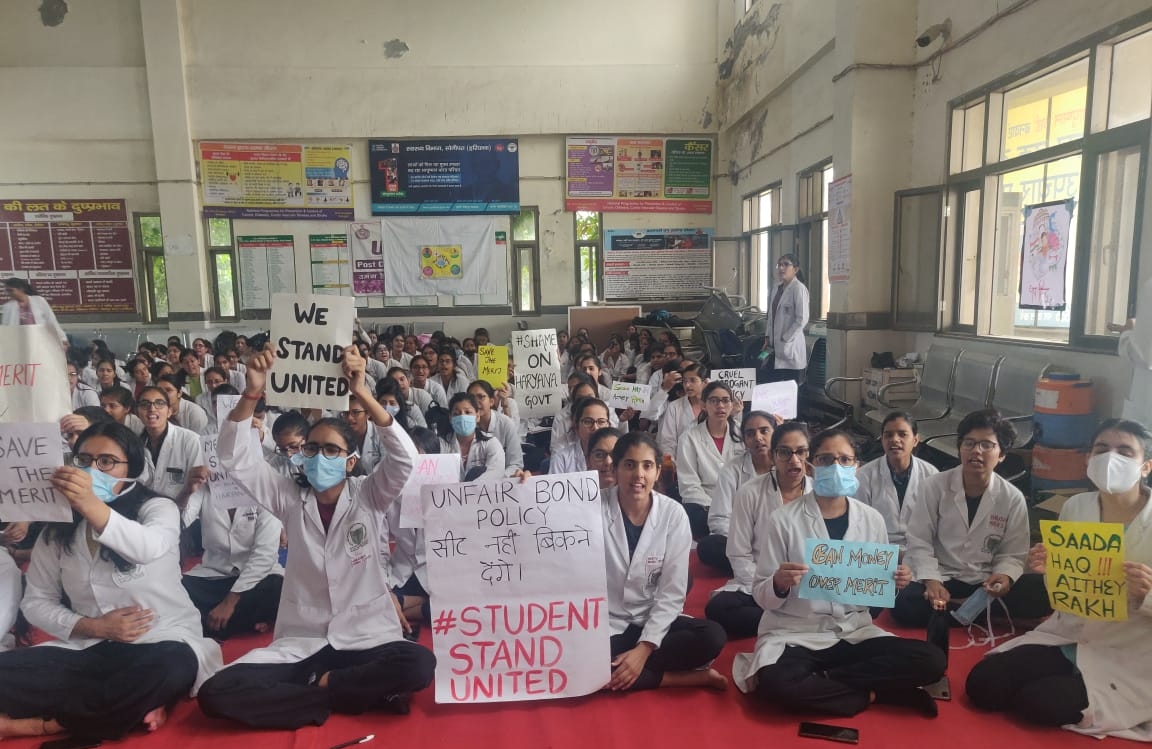गुरुग्राम 4 नवंबर – हरियाणा के 8 मेडिकल कॉलेज के छात्र कई दिनों से हड़ताल कर रहे हैंl हरियाणा सरकार ने नया कानून बनाया जिसमें हरियाणा के मेडिकल कॉलेज में पढ़ने वाले छात्रों को 10 लाख सालाना का बॉन्ड भरवाया जा रहा हैl अगर एमबीबीएस के बाद 7 वर्ष हरियाणा सरकार के अस्पताल में नौकरी नहीं की तो छात्र से 40 लाख रुपए हरियाणा सरकार बरामद करेगीl छात्रों ने इसका पुरजोर विरोध किया है और सभी मेडिकल कॉलेजों में विरोध प्रदर्शन चल रहा हैl नए कानून में कोई स्पष्टता नहीं है की नौकरी ना मिली तो डॉक्टर क्या करेगाl नौकरी मिलने की कोई गारंटी हरियाणा सरकार नहीं दे रही हैl नौकरी ना मिलने पर यह बच्चे कहां जाएंगे और बॉन्ड के पैसे कैसे चुकाएंगे ? कोई छात्र पोस्ट ग्रेजुएशन के लिए कैसे इम्तिहान दे पाएगा इसकी भी साफ नीति नहीं बनाई गई हैl
