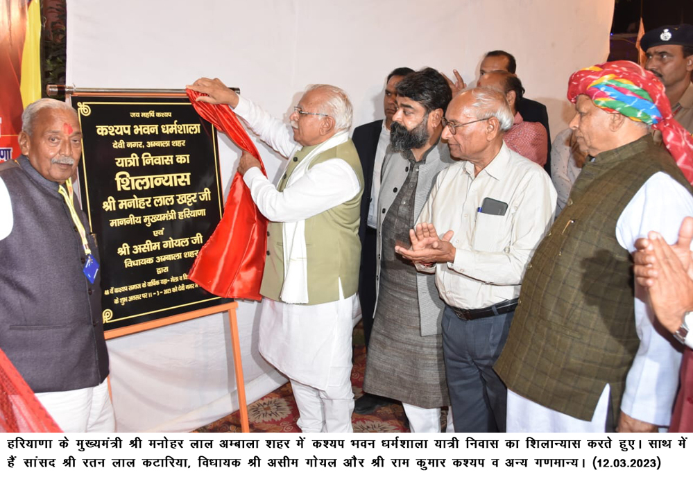 चंडीगढ़, 12 मार्च- हरियाणा के मुख्यमंत्री श्री मनोहर लाल ने शनिवार को कश्यप राजपूत पंजाबी वैल्फेयर सोसायटी व ऑल इंडिया कश्यप राजपूत सभा द्वारा देवीनगर अम्बाला शहर में आयोजित 48वें वार्षिक मेले मे बतौर मुख्य अतिथि शिरकत की। इस अवसर पर उन्होंने परिसर में यात्री निवास का शिलान्यास भी किया। इस मौके पर सांसद श्री रतनलाल कटारिया, विधायक श्री असीम गोयल, इंद्री के विधायक श्री राम कुमार कश्यप उपस्थित रहे।