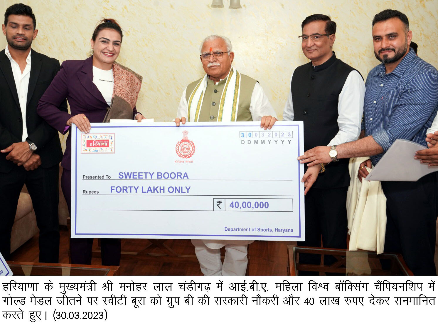 मुलाकात के दौरान मुख्यमंत्री ने चंडीगढ़ स्थित अपने संत कबीर कुटीर आवास पर एक कार्यक्रम में इन दोनों खिलाडिय़ों को 40-40 लाख रुपये का चैक तथा हरियाणा उत्कृष्ट खिलाड़ी सेवा नियम के अंतर्गत ग्रुप बी की नौकरी का ऑफर लेटर की पेशकश भी की।