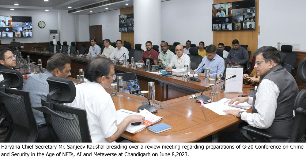 गुरुग्राम, 8 जून। जी-20 के एंटी करप्शन वर्किंग ग्रुप की बैठक (1 से 3 मार्च, 2023) के सफल आयोजन के उपरांत गुरुग्राम में एक बार फिर से आगामी 13 व 14 जुलाई को एनएफटी, एआई और मेटावर्स के युग में अपराध और सुरक्षा विषय पर दो दिवसीय जी-20 सम्मेलन का आयोजन होगा। हरियाणा के मुख्य सचिव श्री संजीव कौशल ने आगामी सम्मेलन की तैयारियों को लेकर आज केंद्रीय गृह मंत्रालय व हरियाणा सरकार के वरिष्ठ अधिकारियों के साथ समीक्षा बैठक की। इस बैठक में विशेष सचिव (आंतरिक सुरक्षा) भारत सरकार शिवगामी सुंदरी नंदा, पुलिस महानिदेशक हरियाणा पी.के. अग्रवाल, अतिरिक्त मुख्य सचिव गृह टीवीएसएन प्रसाद, मुख्यमंत्री के अतिरिक्त प्रधान सचिव एवं सूचना जनसम्पर्क, भाषा तथा संस्कृति विभाग के महानिदेशक डॉ. अमित अग्रवाल, मानव संसाधन विभाग के विशेष सचिव आदित्य दहिया व राज्य और गृह मंत्रालय के वरिष्ठ अधिकारी उपस्थित थे।