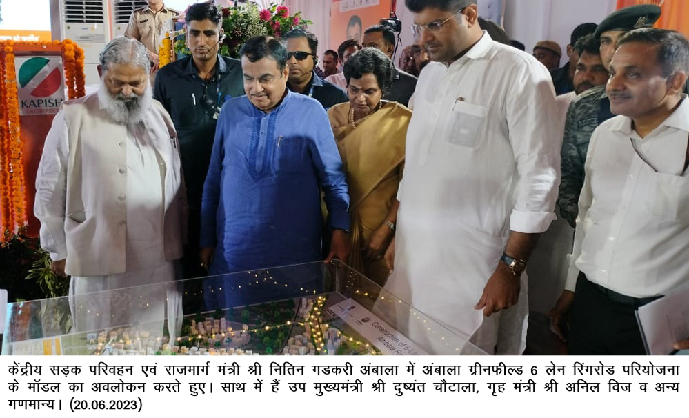 चंडीगढ़, 20 जून। केंद्रीय सडक़, परिवहन एवं राजमार्ग मंत्री नितिन गडक़री ने आज सांय अम्बाला ग्रीनफील्ड 6 लेन रिंगरोड परियोजना का शिलान्यास किया और अम्बाला से साहा तक 4 लेन एनएच-444ए का लोकार्पण किया। इसकी कुल लम्बाई 38 किलोमीटर, कुल लागत 1255 करोड़ रूपए हैं। इस अवसर पर हरियाणा के उपमुख्यमंत्री श्री दुष्यंत चौटाला, हरियाणा के गृह, स्वास्थ्य, चिकित्सा एवं अनुसंधान आयुष मंत्री श्री अनिल विज, शाहबाद के विधायक रामकरण, एनएचएआई के सदस्य मनोज कुमार, भाजपा जिला प्रधान राजेश बतौरा आदि भी उपस्थित रहें।