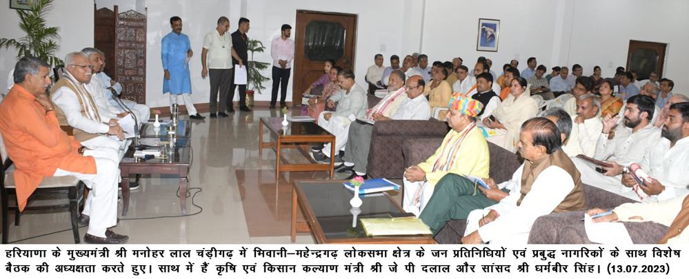 मुख्यमंत्री आज भिवानी-महेंद्रगढ़ लोकसभा क्षेत्र के जनप्रतिनिधियों से बातचीत कर रहे थे। कृषि एवं किसान कल्याण मंत्री श्री जे पी दलाल, भिवानी-महेंद्रगढ़ लोकसभा के सांसद श्री धर्मबीर सिंह, सामाजिक न्याय अधिकारिता एवं अनुसूचित जाति कल्याण मंत्री श्री ओमप्रकाश यादव, विधायक अभय सिंह यादव, सीताराम यादव, घनश्याम सर्राफ, मुख्यमंत्री के राजनीतिक सलाहकार भारत भूषण भारती, मुख्यमंत्री के ओएसडी भूपेश्वर दयाल, पूर्व विधायक श्रीमती संतोष यादव, पूर्व विधायक शशी रंजन परमार सहित कई पार्टी पदाधिकारी मौजूद रहे।