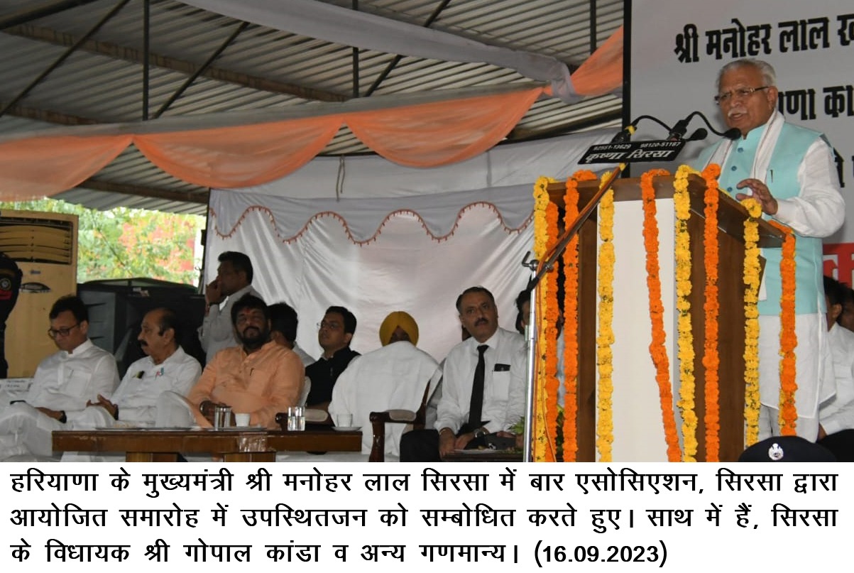 मुख्यमंत्री शनिवार को बार एसोसिएशन सिरसा द्वारा आयोजित एक कार्यक्रम को संबोधित कर रहे थे। इस अवसर पर विधायक श्री गोपाल कांडा भी उपस्थित रहे।