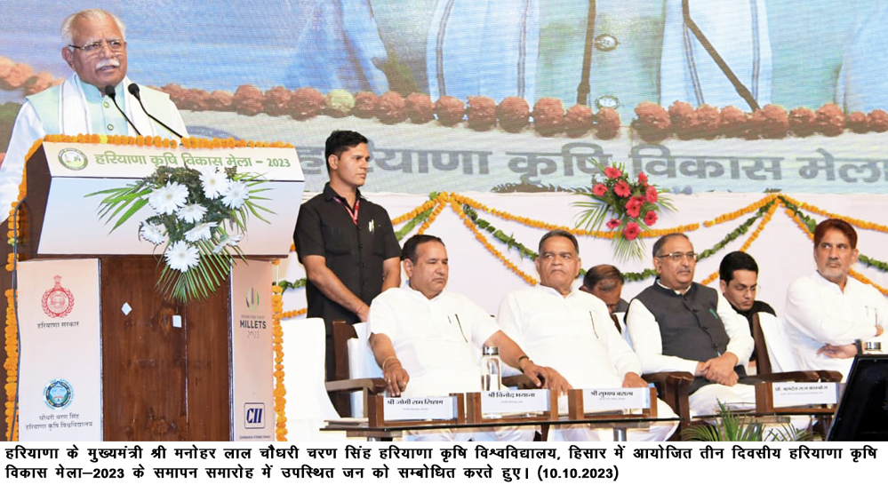 चण्डीगढ़, 10 अक्तूबर – हरियाणा के मुख्यमंत्री श्री मनोहर लाल ने कहा है कि हरियाणा किसान प्रधान प्रदेश है। यहाँ के किसानों ने कृषि के साथ-साथ अन्य क्षेत्रों में अपना परचम देश और दुनिया में लहराया है। मुख्यमंत्री मनोहर लाल मंगलवार को चौधरी चरण सिंह हरियाणा कृषि विश्वविद्यालय हिसार में आयोजित कृषि मेले के समापन समारोह में किसानों को संबोधित कर रहे थे। इस अवसर पर उन्होंने विभिन्न प्रकार के कृषि उपकरणों, खाद-बीज की लगाई गई प्रदर्शनी का अवलोकन कर जानकारी प्राप्त की।