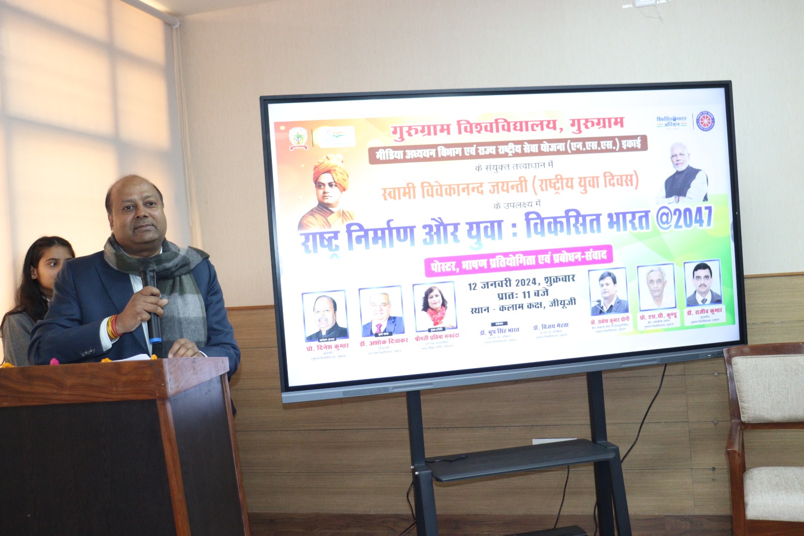 गुरूग्राम, 12 जनवरी। शुक्रवार को गुरुग्राम विश्वविद्यालय में राष्ट्रीय युवा दिवस के अवसर पर विवि. के मीडिया अध्ययन विभाग एवं एनएसएस इकाई ने भाषण प्रतियोगिता, प्रबोधन संवाद के माध्यम से स्वामी विवेकानंद की जयंती मनाई। इस मौके पर उपस्थित गुरुग्राम विवि. के कुलपति एवं कार्यक्रम अध्यक्ष प्रो. दिनेश कुमार, स्टॉरेक्स यूनिवर्सिटी के पूर्व कुलपति एवं कार्यक्रम के मुख्य वक्ता डॉ. अशोक दिवाकर, राष्ट्र सेविका समिति की प्रान्त सह कार्यवाहिका एवं कार्यक्रम की मुख्य अतिथि प्रतिमा मनचंदा, सामाजिक कार्यकर्ता जगदीश ग्रोवर ने कार्यक्रम में भाग लेते हुए स्वामी विवेकानंद के आदर्शों और संदेशों से विद्यार्थियों को प्रोत्साहित व प्रेरित किया ।