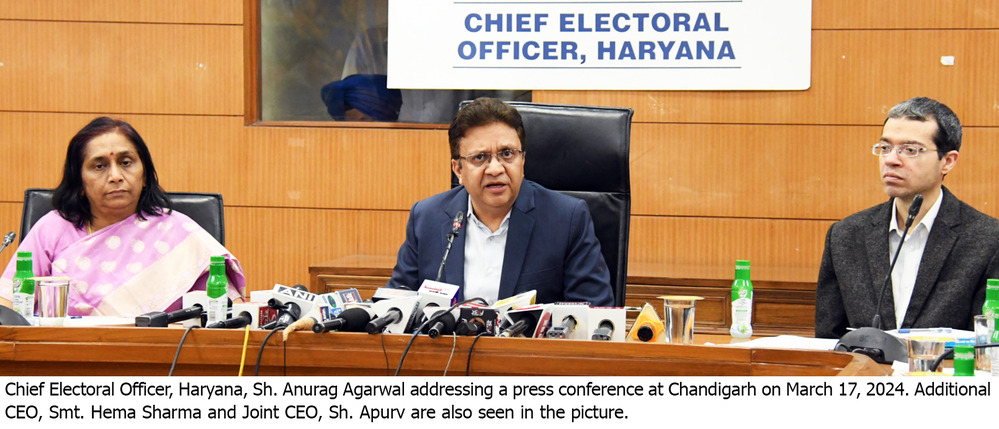 चंडीगढ़, 17 मार्च- हरियाणा के मुख्य निर्वाचन अधिकारी श्री अनुराग अग्रवाल ने कहा कि लोकसभा 2024 के आम चुनाव की घोषणा के साथ आदर्श आचार संहिता लागू हो गई है। अब नई विकास परियोजनाओं की हरियाणा सरकार घोषणा नहीं कर सकती। जिन परियोजनाओं पर कार्य चल रहा है वे जारी रहेगा। चुनाव आचार संहिता के उल्लंघन के बारे शिकायत दर्ज करने के लिए चुनाव आयोग ने सी-विजिल एप बनाया है, जिस पर कोई भी नागरिक वीडियो व आडियो बनाकर भेज सकता है, जिस पर 100 मिनट में कार्रवाई की जाएगी। यह एप चुनाव आयोग की पैनी नजर के रूप में कार्य करेगा।