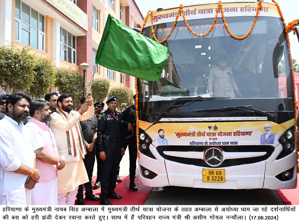 पुलिस डीएवी पब्लिक स्कूल, अम्बाला शहर के प्रांगण से सूचना, जन सम्पर्क, भाषा एवं संस्कृति विभाग की मुख्यमंत्री तीर्थ यात्रा योजना के तहत एसी वोल्वो बस को हरी झंडी देने के उपरांत पत्रकारों से बातचीत कर रहे थे। इस अवसर पर परिवहन मंत्री असीम गोयल, सूचना, जनसम्पर्क एवं भाषा विभाग के महानिदेशक मंदीप सिंह बराड़, उपायुक्त डॉ. शालीन, एसपी जश्न दीप सिंह रंधावा, संयुक्त निदेशक गौरव गुप्ता, भाजपा जिला प्रधान मनदीप राणा मौजूद रहे। इस दौरान श्रद्धालुओं को सूचना, लोक सम्पर्क, भाषा तथा संस्कृति विभाग की ओर से एक-एक किट बैग भी उपलब्ध करवाया गया।
