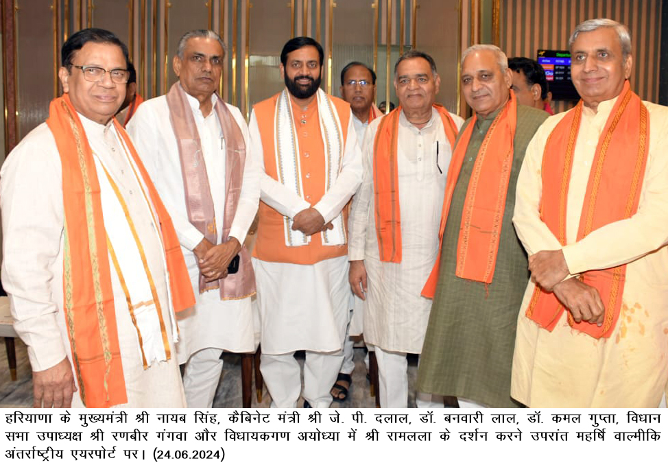 चंडीगढ़, 24 जून – हरियाणा के मुख्यमंत्री श्री नायब सिंह ने आज संपूर्ण मंत्रिमंडल और विधायकों के साथ अयोध्या में श्री रामलला के दर्शन किए और प्रदेशवासियों के सुख व समृद्धि की कामना की।