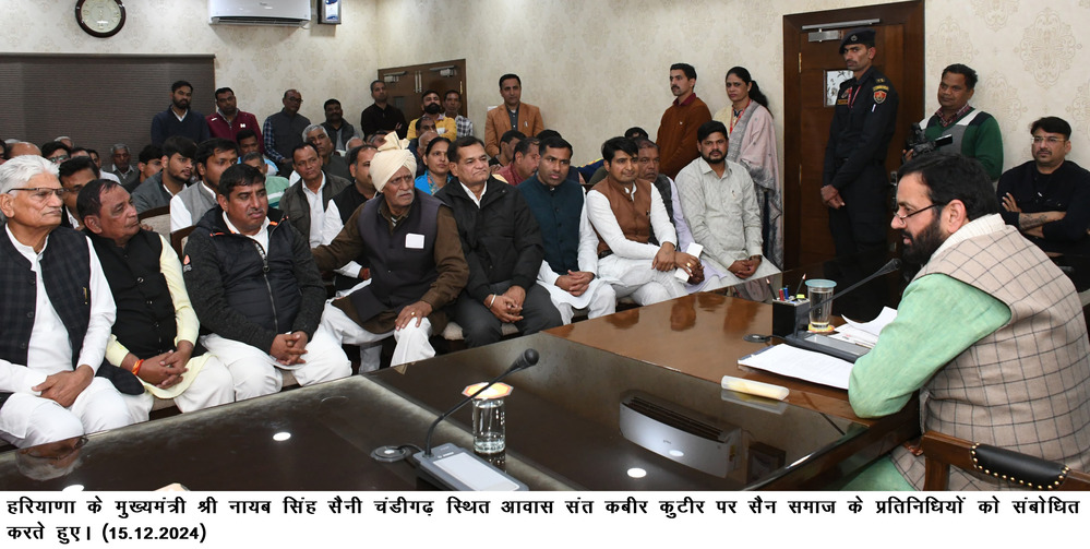 चंडीगढ़, 15 दिसंबर – हरियाणा के मुख्यमंत्री श्री नायब सिंह सैनी ने आज यहां उनके निवास संत कबीर कुटीर पर प्रदेशभर से आए सैन समाज के प्रतिनिधियों को संबोधित करते हुए कहा कि सरकार द्वारा संत शिरोमणि श्री सैन जी महाराज की जयंती को अगले वर्ष राज्य स्तर पर भव्य तरीके से मनाया जाएगा।