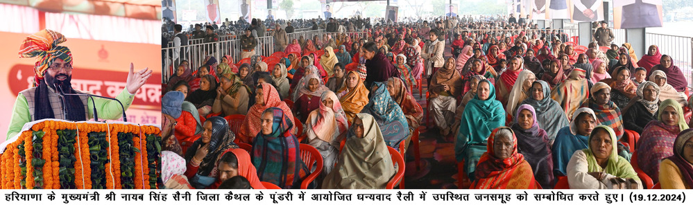 चंडीगढ़, 19 दिसंबर – हरियाणा के मुख्यमंत्री श्री नायब सिंह सैनी ने आज पूंडरी विधानसभा क्षेत्र में धन्यवाद रैली को संबोधित करते हुए हल्का वासियों के लिए बड़ी घोषणा करते हुए कहा कि पूंडरी को जल्द ही उपमंडल का दर्जा दिया जाएगा। उन्होंने कहा कि राज्य सरकार द्वारा उप मंडल या जिला घोषित करने के संबंध में कमेटी गठित की हुई है और पूंडरी को उप मंडल बनाने के संबंध में कमेटी के पास आवेदन प्रस्तुत किया गया है, जैसे ही कमेटी की रिपोर्ट आएगी, उसके बाद इसे उपमंडल का दर्जा दिया जाएगा।
