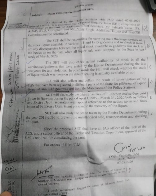 क्या गृहसचिव व गृहमंत्री द्वारा 2019-20 के बीच नाजायज शराब पकड़े जाने, नाजायज शराब की ट्रांसपोटेशन तथा पकड़ी गई शराब की स्टोरेज बारे हुई कार्यवाही की पूरी रिपोर्ट SET द्वारा दिए जाने की सिफारिश की थी? तो फिर मुख्यमंत्री, श्री खट्टर ने इस जांच को SET को ना देकर अलग से फाइल मंगवाने बारे क्यों लिखा? वो क्या रहस्य था तथा वो कौन से नाम थे जिनकी जांच मुख्यमंत्री SET द्वारा नहीं करवाना चाहते थे?
