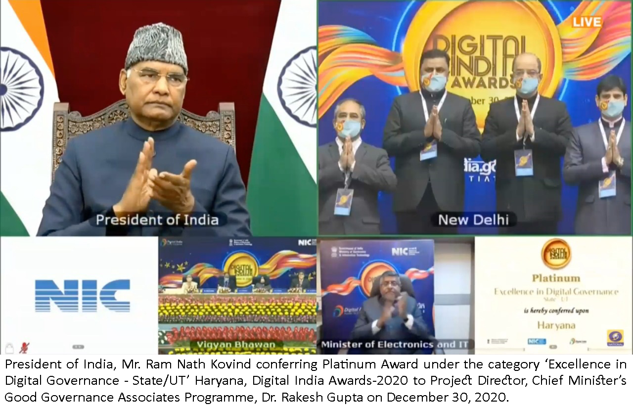 चंडीगढ़, 30 दिसंबर- राष्ट्रपति श्री रामनाथ कोविंद ने आज हरियाणा को अंत्योदय सरल पोर्टल के लिए डिजिटल इंडिया अवार्ड 2020 से सम्मानित किया। हरियाणा को इलेक्ट्रॉनिक्स और सूचना प्रौद्योगिकी मंत्रालय द्वारा ‘एक्सीलेंस इन डिजिटल गवर्नेंस – स्टेट/यूटी’ की श्रेणी में प्लेटिनम अवार्ड दिया गया है। इस अवसर पर केन्द्रीय सूचना प्रौद्योगिकी मंत्री श्री रविशंकर प्रसाद भी विशेष रूप से उपस्थित रहे।