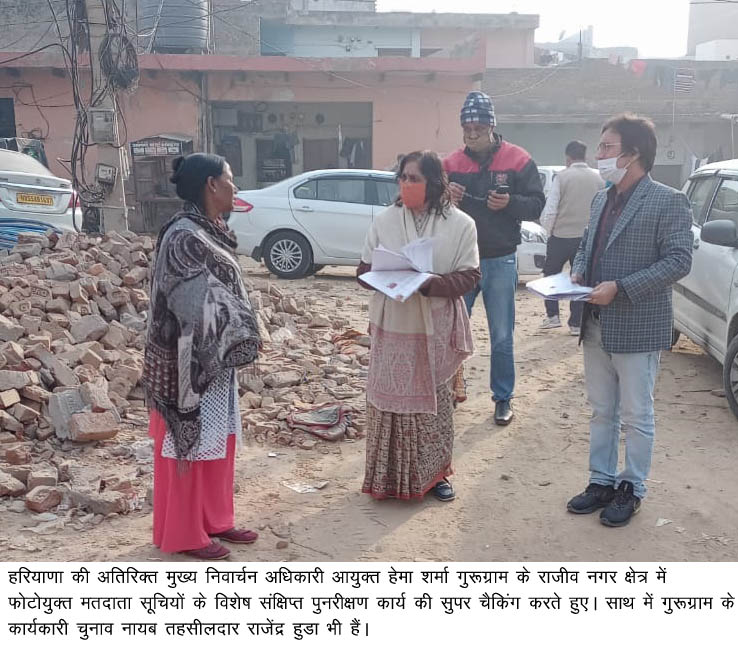 गुरुग्राम 31 दिसंबर। एक जनवरी 2021 को क्वालिफाइन तिथि मानकर जिला गुरूग्राम में किए गए फोटोयुक्त मतदाता सूचियों के विशेष संक्षिप्त पुनरीक्षण अभियान में प्राप्त दावे व आपतियों की सुपर चैकिंग आज प्रदेश की अतिरिक्त मुख्य निवार्चन अधिकारी हेमा शर्मा ने की। उन्होंने जिला चुनाव कार्यालय में गुरूग्राम सहित झज्जर, रेवाड़ी, नूंह, नारनौल तथा रोहतक जिलों के चुनाव अधिकारियों के साथ बैठक कर उनके रिकाॅर्ड का निरीक्षण किया। इसके बार उन्होंने गुरूग्राम के सैक्टर-4 व राजीव नगर आदि क्षेत्रों में जाकर दावे व आपतियों की सत्यता जानने के लिए मौका मुआयना भी किया।