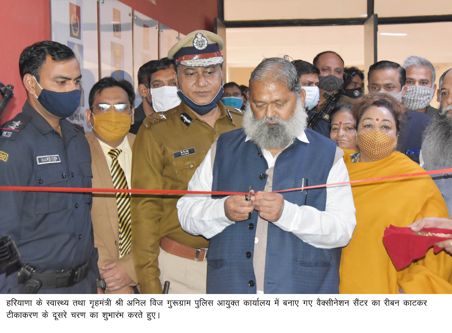 गुरूग्राम, 04 फरवरी। हरियाणा के स्वास्थ्य तथा गृहमंत्री श्री अनिल विज ने आज कोरोना वैक्सीनेशन के प्रदेशभर में दूसरे चरण की शुरूआत गुरूग्राम से की। उन्होंने गुरूग्राम के पुलिस आयुक्त कार्यालय में बनाए गए वैक्सीनेशन सैंटर का रीबन काटकर इस टीकाकरण अभियान का शुभारंभ किया।