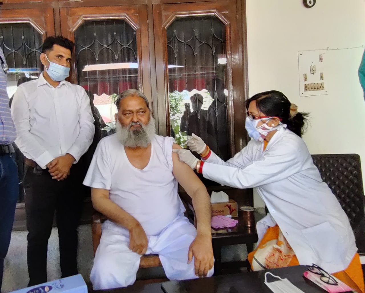 चंडीगढ़, 24 अप्रैल 2021 : हरियाणा के गृह मंत्री अनिल विज आज ने कोरोना वैक्सीन की पहली डोज़ लगवाई। उन्होंने अंबाला स्थित आवास पर कोरोना रोकथाम के लिए टीका लगावाया। गौर रहे कि अनिल विज को पहले भी कोरोना महामारी से बचाव के लिए भारत बायोटेक द्वारा निर्मित टीके कोवैक्सीन के तीसरे चरण के ट्रायल के दौरान 20 नवंबर को अंबाला के एक सरकारी अस्पताल में कोवैक्सीन की खुराक दी गई थी।अनिल विज ने स्वेच्छा से सबसे पहले कोवैक्सीन टीका लगवाने के लिए वॉलंटियर बनने की पेशकश की थी। वैक्सनी लगवाने के बाद विद पॉजिटिव पाए गए थे।