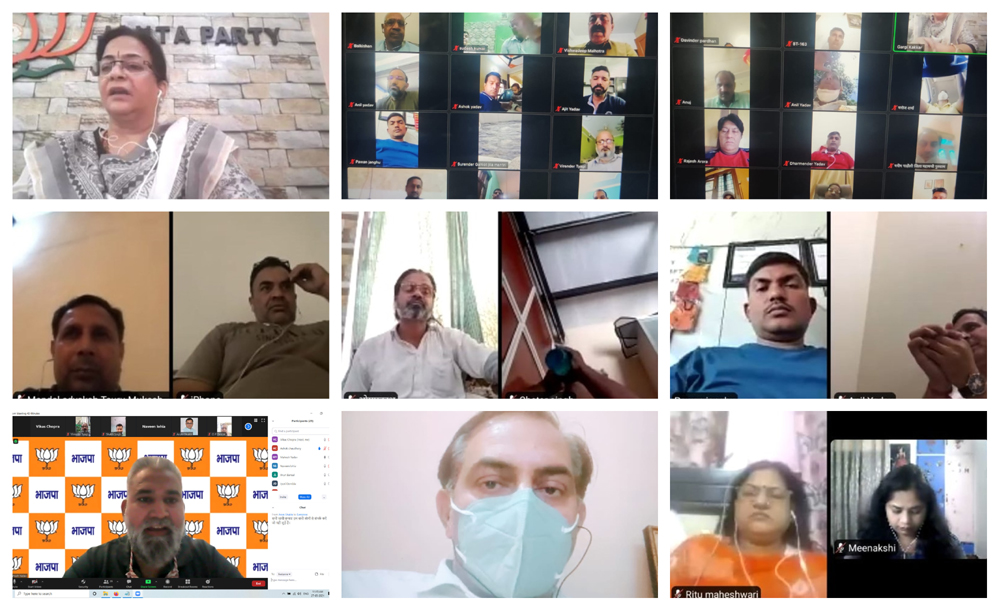 श्रीमती कक्कड़ ने जोर देकर कहा कि हिम्मत का हथियार सबसे बड़ा हथियार होता है, कोरोना हारेगा भारत जीतेगा।जूम द्वारा वर्चूअल संवाद से जुडऩे वालों में जिला पदाधिकारियों में जिला महामंत्री मनीष गाड़ौली, महेश यादव कार्टरपुरी, अनिल यादव सरपंच, राजेश अरोड़ा, हर्षवर्धन मित्तल, सोनाली मित्रा, हरबीर अधाना सरपंच, ज्योति डेम्बला, यादराम जोया, सुरेन्द्र गहलोत, दिनेश राघव, सोनिया यादव, प्रदीप जैलदार, जयंती चौधरी, अजीत यादव, जितेन्द्र चौहान, नीरज यादव, रामबीर भाटी, कुलदीप यादव, श्रीचन्द गुप्ता, सुन्दर लाल सरपंच, विधानसभा प्रभारियों में अरुण बंसल, प्रवीन चन्द्र वशिष्ठ, विश्वदीप मल्होत्रा, अनिल गंडास, मंडल प्रभारियों में पवन जांघू, जगदीश अम्बावत, सतपाल राघव, रामचंद्र भारद्वाज, वेदप्रकाश यादव, राजबीर मानेसर, सुरेश प्रधान, हंसराज सैनी, महेन्द्र यादव, विरेन्द्र त्यागी, अनिल यादव बिट्टू, राव रणधीर, एम$ आर$ लारोइया, प्रदीप गुर्जर, मण्डल अध्यक्षों में कृष्ण यादव, अभय चौहान, देवेन्द्र यादव, सुनील कुमार, विरेन्द्र सिंह सरपंच, दौलतराम, रामनिवास, आरुणी शुक्ल, श्रवण आहुजा, नितिन शांडिल्य, अभिषेक गुलाटी, प्रियवर्त कटारिया, गौरव चुघ, मनोज कुमार, मुकेश शर्मा एवं मंडलों के महामंत्री हैं।