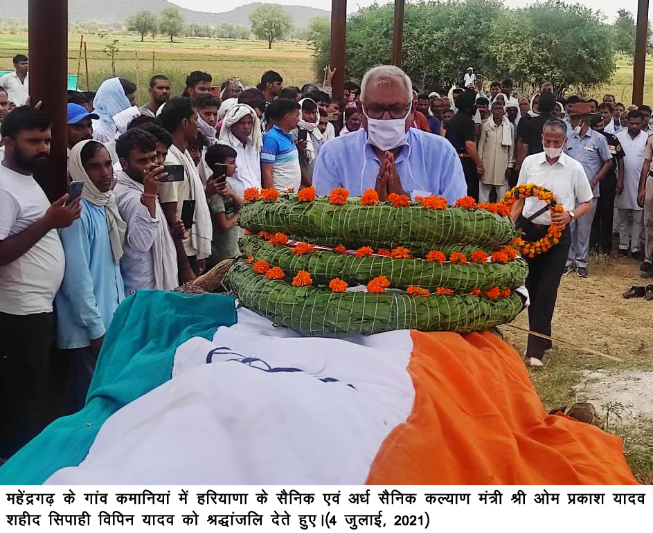 चंड़ीगढ़, 4 जुलाई- हरियाणा के सैनिक एवं अर्ध सैनिक कल्याण मंत्री श्री ओम प्रकाश यादव ने लेह में ड्यूटी के दौरान शहीद हुए सिपाही विपिन यादव को आज उनके पैतृक गांव कमानिया, महेंद्रगढ़ पहुंचकर श्रद्धांजलि दी और पुष्पचक्र अर्पित किया।